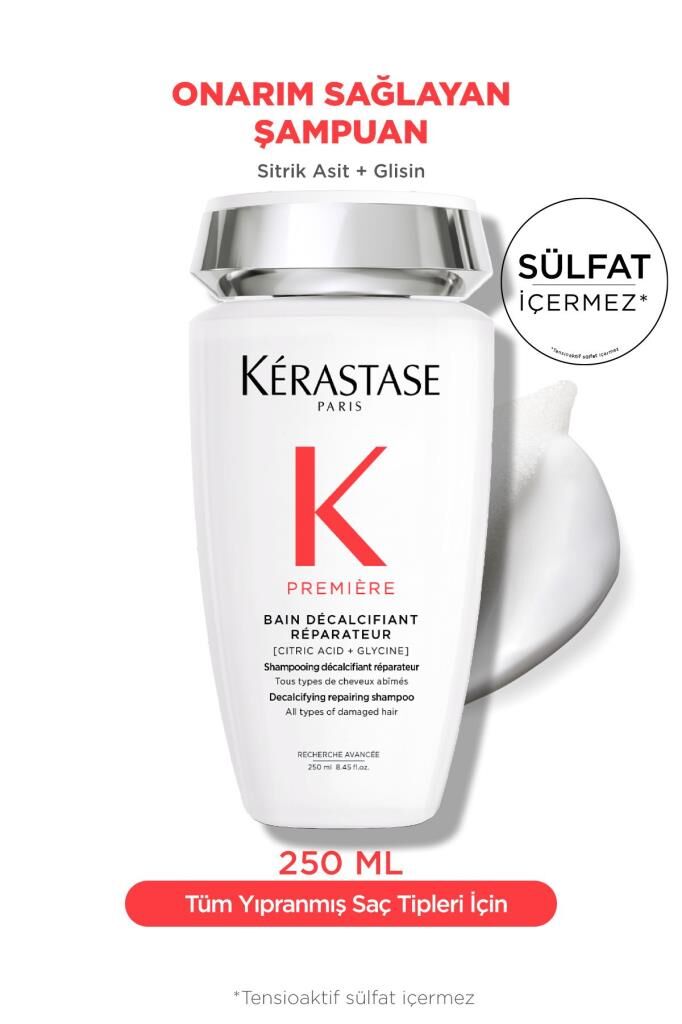 Beyaz kremsi dokudan lüks bir köpük deneyimi yaratan Kérastase Première Bain Décalcifiant yıpranmış saçlara özel onarıcı şampuan, saçta sudan kaynaklanan kalsiyum birikimine karşı çift etkili bir onarıcı bakım sunar. Aşırı işlem görmüş veya yıpranmış saçları olumsuz etkileyen kalsiyumu azaltır. Saçtaki kopmuş keratin bağlarını onararak saçın iç yapısında yapılandırma sağlar. Saçlar pürüzsüz, parlak ve canlı bir görünüme kavuşur; böylece daha kolay kontrol altına alınabilir.